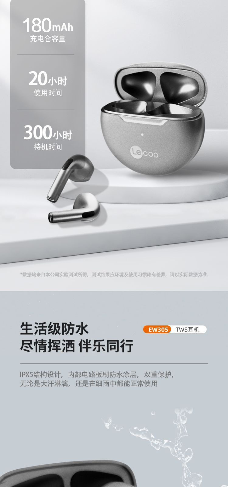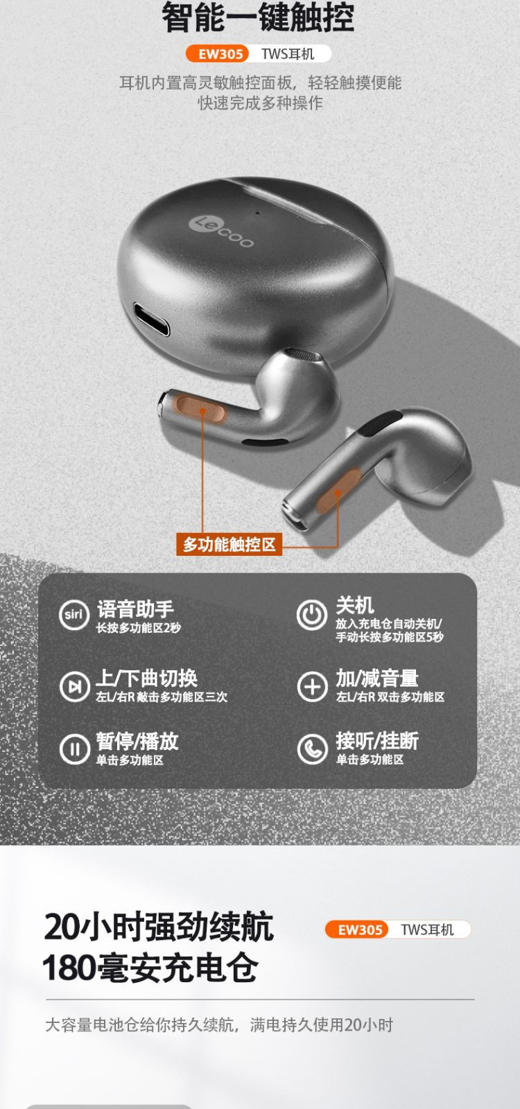 联想来酷EW305蓝牙耳机 半入耳式长续航 安卓苹果通用